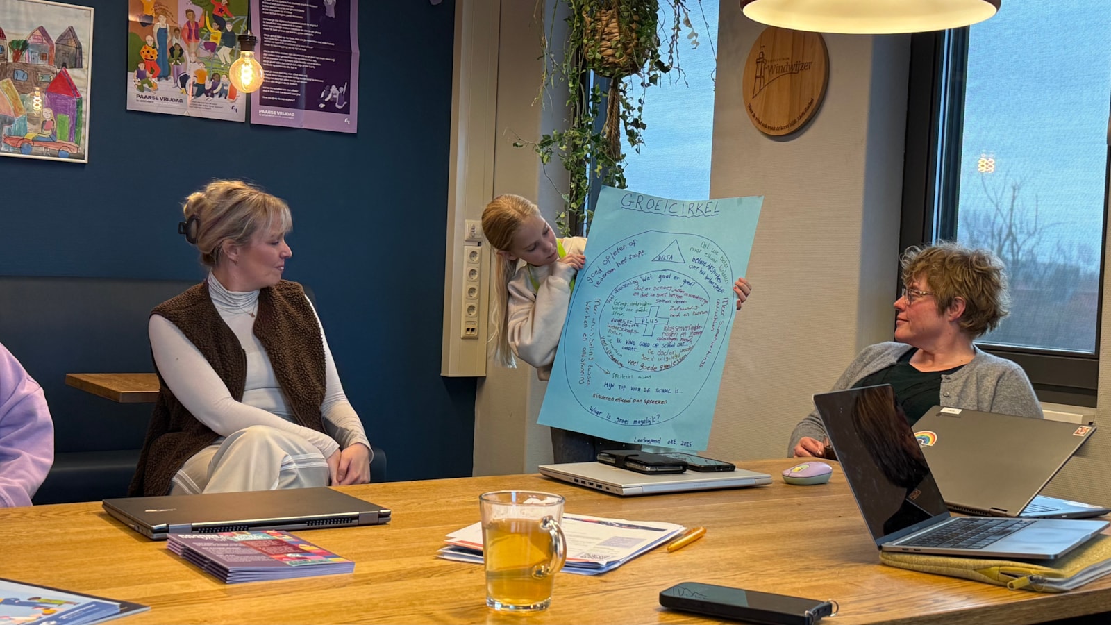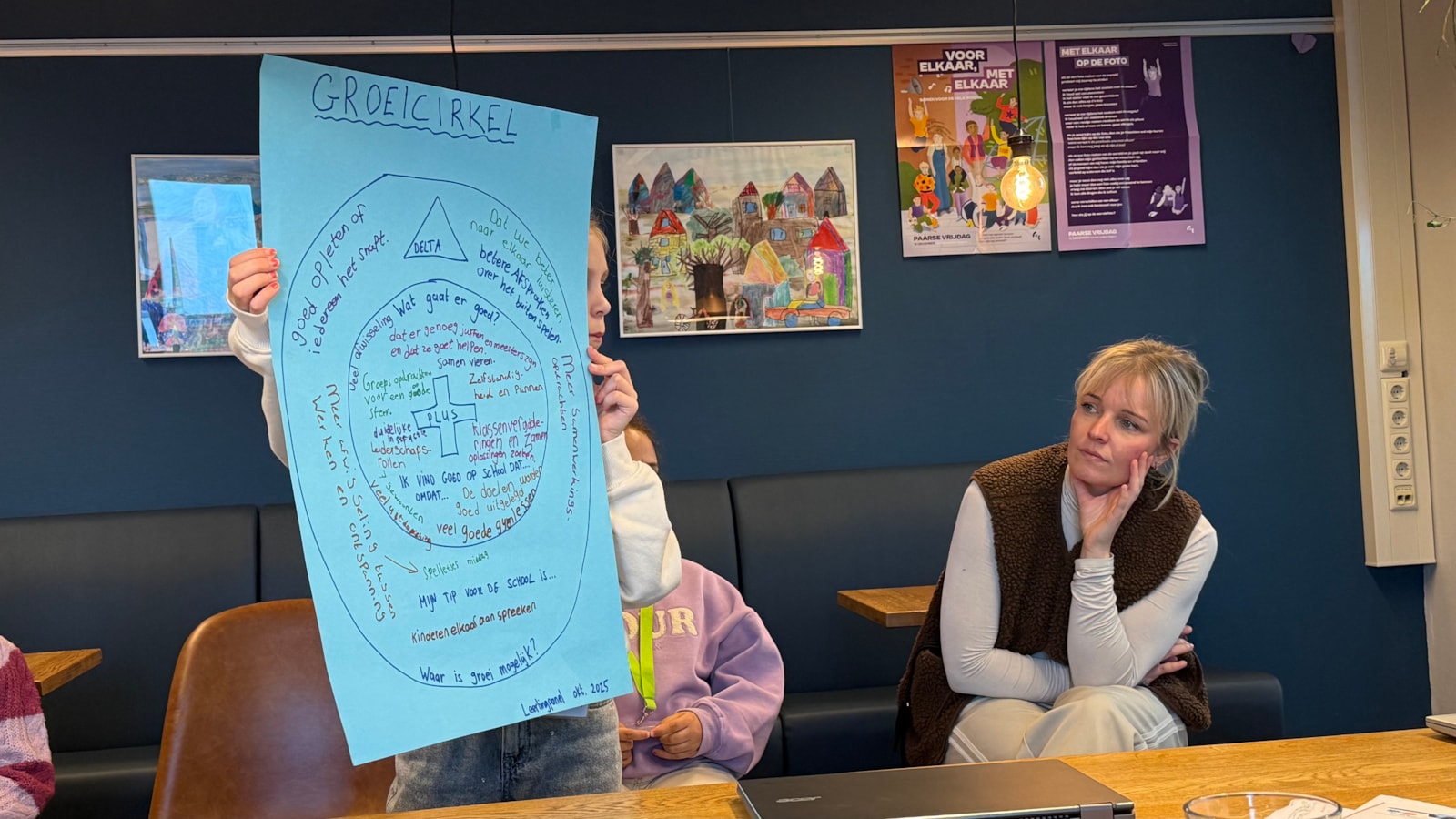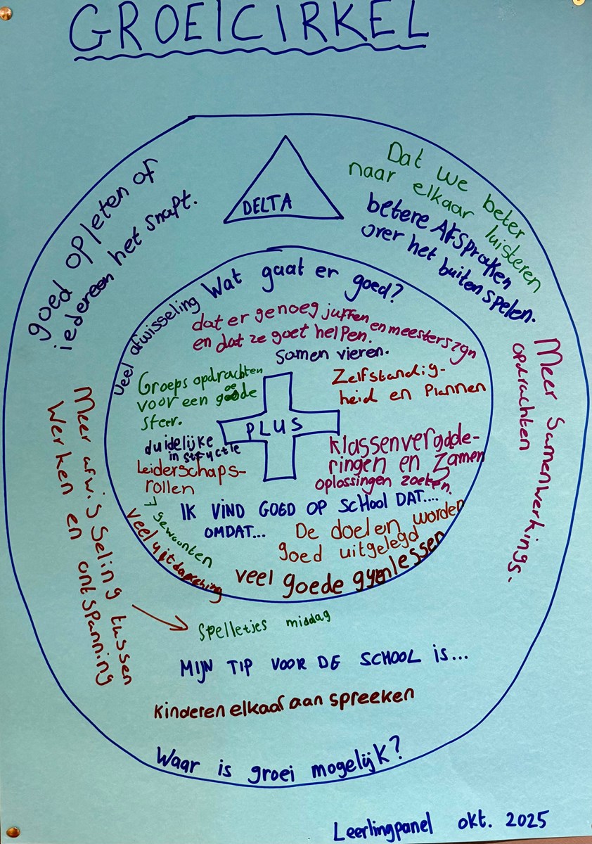 Wij waren te gast bij de medezeggenschapsraad. Dat is een groep ouders en meesters en juffen die vergaderen over hoe het gaat op school. Ze mogen ook zeggen wat ze wel en wat ze niet goed vinden. Wij van het leerlingpanel hebben tijdens de vergadering de groeicirkel gepresenteerd die we hebben gemaak. Hierbij hebben we opgeschreven wat er goed gaat op school. We hebben ook dingen opgeschreven waar de school nog beter in kan worden. We hebben ook verteld wat we hebben gedaan tijdens de leerlingpaneldag. Hierover stond ook een stuk in de Kopkrant. Er waren ook twee mensen van De Driemaster om te kijken hoe wij als leerlingpanel werken. Zij willen ook daarmee beginnen. Het was een leuke middag met de MR-mensen. Het was ook wel spannend om te praten in een grote groep. Met de startzinnen lukte dat wel.