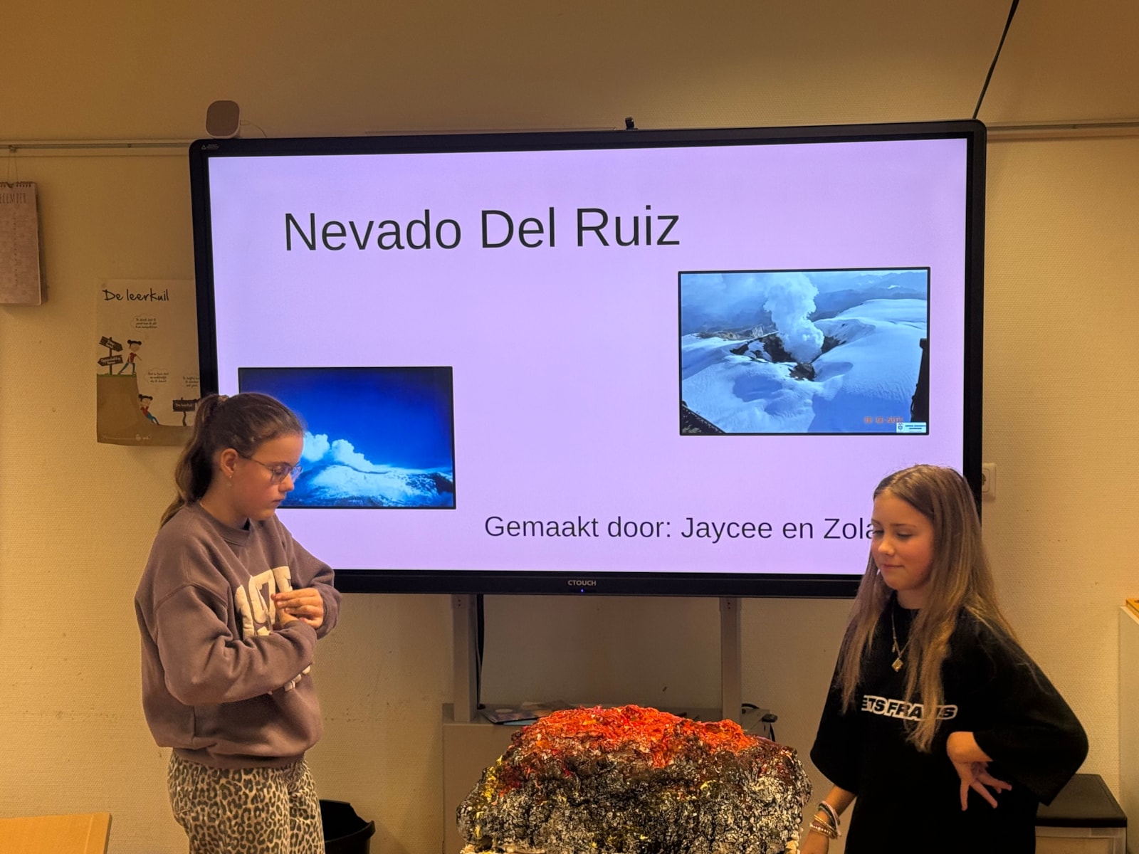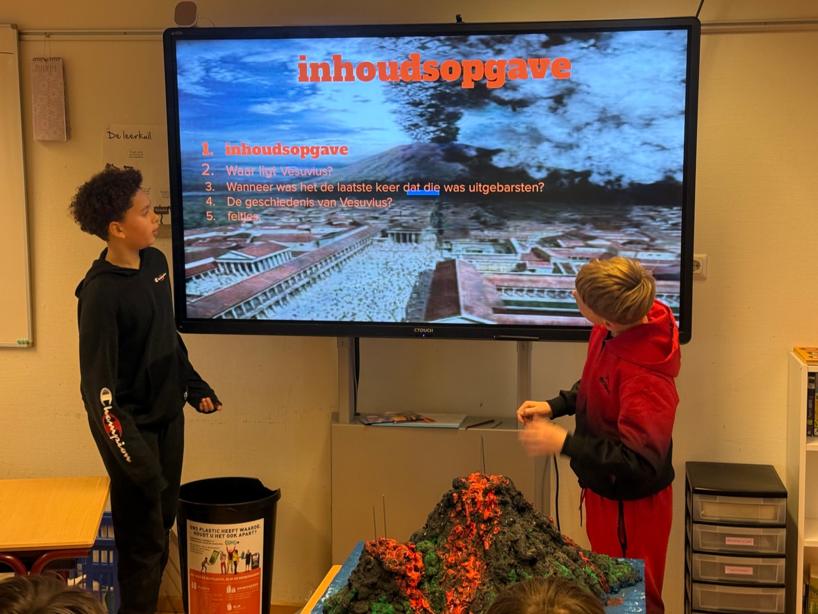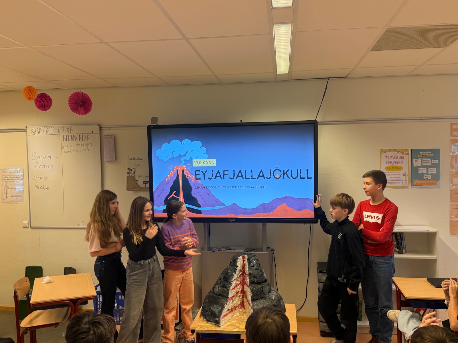 De afgelopen weken hebben de leerlingen van groep 8 hard gewerkt aan het project De Vulkaan. Ieder groepje kreeg een eigen vulkaan toegewezen. Over deze vulkaan hebben zij veel informatie opgezocht, zodat zij de andere leerlingen konden bijpraten over wat zij hadden gevonden en geleerd. Alle leerlingen hebben een goede presentatie gegeven over hun vulkaan, waar we met z’n allen veel van hebben geleerd.
