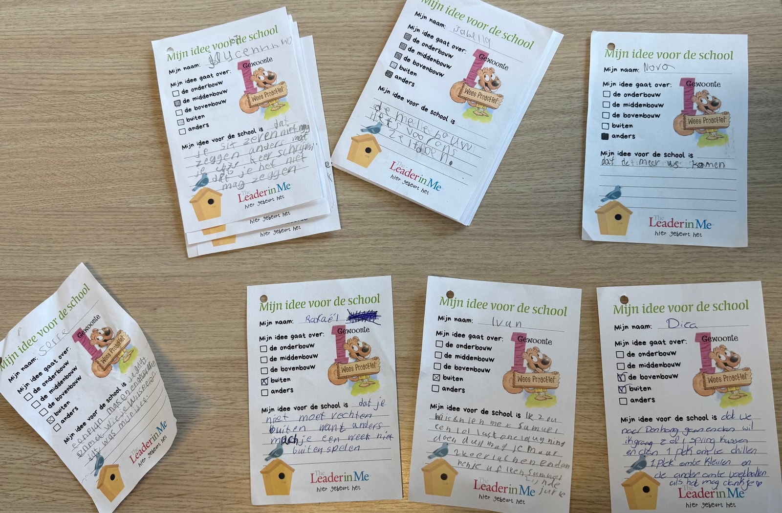 We hebben ook de ideeenbus geleegd en de ideeën gesorteerd. We hebben een stapel gemaakt met wensen en ideeën die we konden uitvoeren. We hebben ook taken verdeeld om te kijken of de de ideeën ook kunnen uitvoeren. Bijvoorbeeld of de wc’s anders kunnen indelen en verschillende ideeen voor buitenspelen.