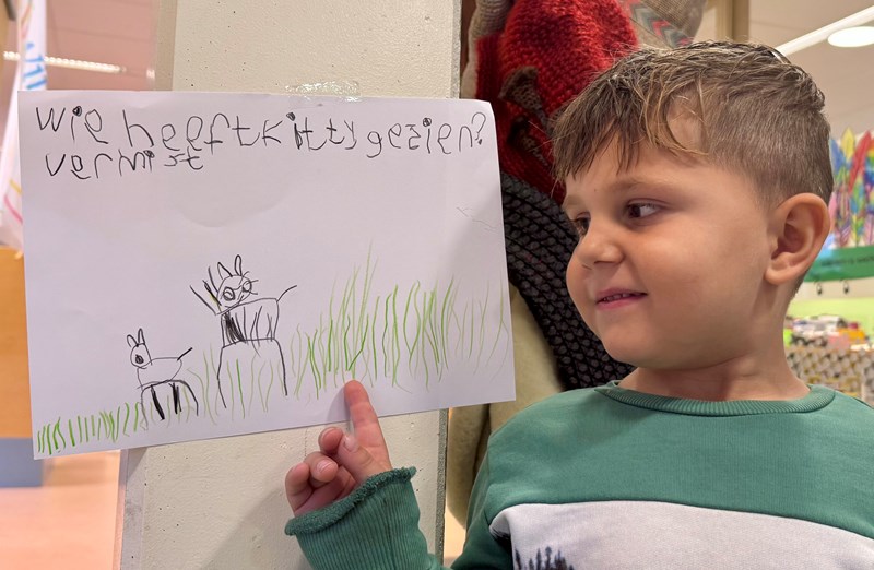 In de onderbouw is de knuffel ‘Kitty’ uit het speelhuis vermist. Tijd voor actie! Een aantal kinderen van de onderbouw hebben aanplakbiljetten gemaakt voor op het Windwijzerlaantje. Zo passen de kinderen het leren lezen en schrijven toe met ontdekkend spellen. Hopelijk komt Kitty snel…